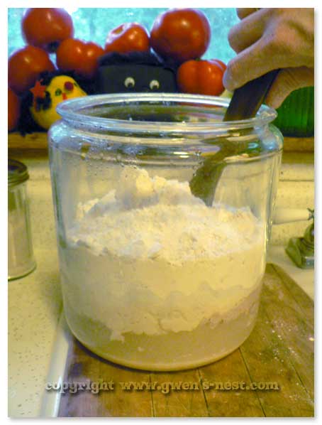Wonka! Wonka! OK, let’s take a minute to talk about equipment for this easy bread recipe: you’ll need a large container (5 quarts/20 cups/1 gallon) with a lid to mix up and store your dough. Since I am now officially addicted to this bread, I bought a large glass ‘cookie jar’ canister at Wally World for $7 because it’s pretty and it stands upright in my fridge to save room. (Had to flip the lid over to get it to fit.) 🙂 This is the ONE gallon size.