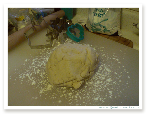 Dust down a large surface area with powdered sugar. Which is like flour, only it’s yummy. Plop dough onto your powdered surface, and rub down rolling pin with more powdered sugar. I like to keep a flat dish of powdered sugar handy, because I will keep dusting the dough down with it, and even dip the cookie cutters in it too.