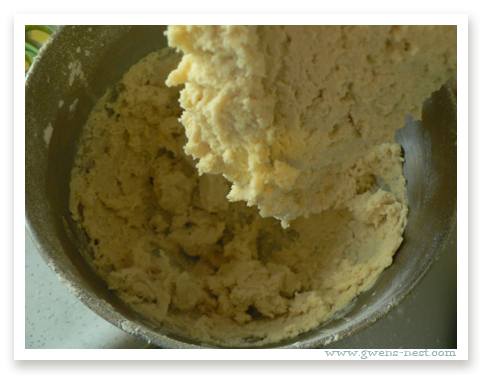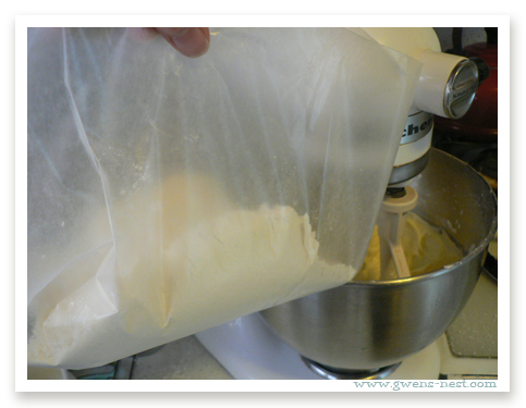 pick up both sides of the wax paper, and funnel the flour into the mixer about 1/3 at a time, mixing between additions. When you’re done, it will look something like this:
