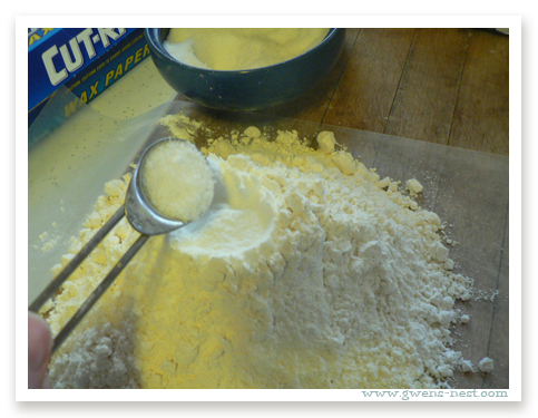 - Measure the flour onto a sheet of wax paper, and mix in baking powder, baking soda, and salt.