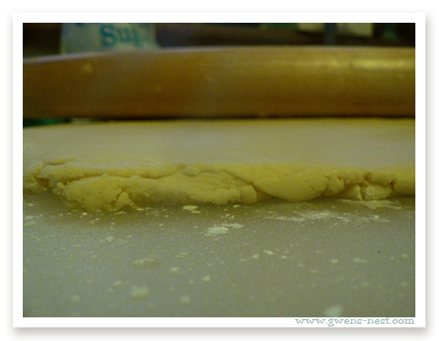 Roll the dough to the thickness you like. I prefer 3/8ths of an inch, which is just a wee bit more than 1/4 inch, and makes much sturdier cookies.