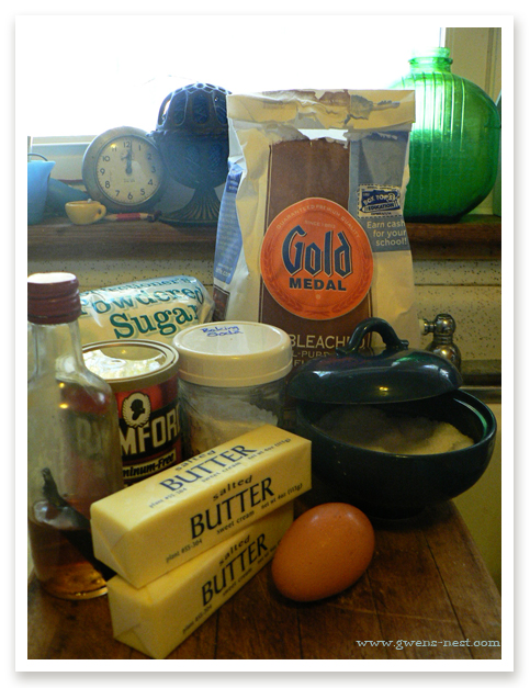 You’ll need butter, eggs, salt, baking powder/soda, flour, regular sugar, powdered sugar, and vanilla extract. And I like to add a touch of lemon oil or lemon extract to the mix too.