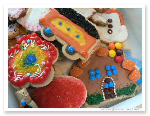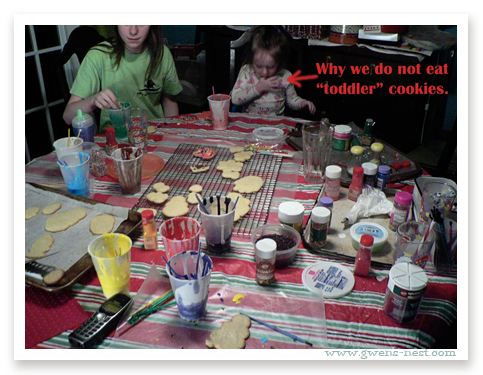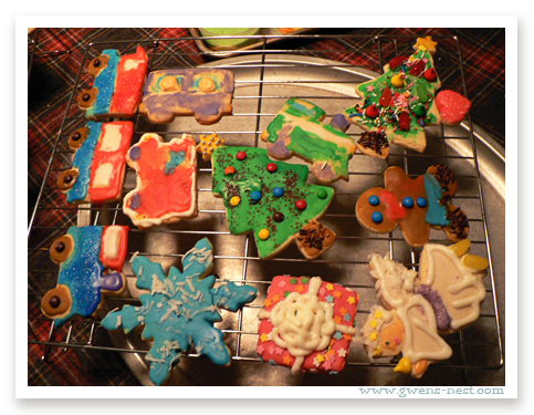 What I’ve found works best is to make a wax paper “placemat” for each decorator. We set out trays full of colored paint-on frosting and loads of little candies and sprinkles (most of which I collect at season-end-clearances prices).